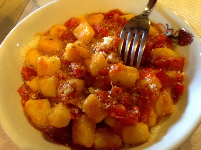 The dining room is filled with patrons – travelers, locals, families, even contractors on their lunch break (gnocchi on a work lunch break – can you imagine??). At noon the handmade gnocchi at Alle Alpi starts rolling off the human assembly line and the people gather. Gnocchi Pomodoro, Gnocchi al Ragu, or Gnocchi with smoked ricotta cheese sauce? Life’s difficult decisions.