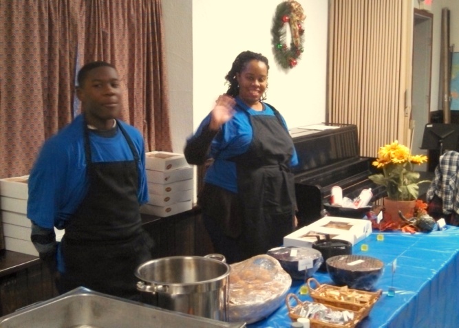 Family members of employees also joined in to help serve the food at the event. A hot satisfying meal was just what was needed for such a cold wet and blustery day. One hundred needy people were served, and many left with containers full of seconds for later.