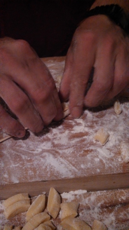 My last trip here I had it served with polenta. A luscious dish that I am convinced took me a week to digest. For the first time on this trip, we are not hungry. We will be having a feast tonight in Timau, so we take it easy. We decide that we must at least have a fresh Moretti Beer – since it is brewed here – or so we thought. Since my last trip, Morretti had been acquired by Heineken and we could not find a single bottle or draft in the entire city – the Italians can be unforgiving. Along the way during our Moretti search, we came across a Sardinian Festival. Streetside vendors featured cheeses, meats and dishes that are typical in Sardinia. We participated in a pasta making lesson where we were taught how to make common eggless fresh Sardinian pasta called Filei. I am always amazed at how easy fresh pasta is, yet when at home I rarely make it. I vow to make this when I return.