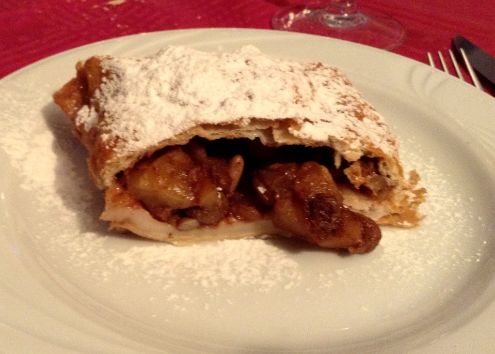 As we pulled up to Albergo Matiz, we could see Diego in his kitchen. The window sill was packed with glass bottles of his famous flavored grappas steeping in the fleeting alpine valley sunshine. We are right on time – dinner is being served. Diego’s restaurant is a gem. They prepare everything fresh from local ingredients. Menus are designed daily based on what is available that day. For the next three days we will be eating classic Friulan dishes prepared by Diego’s award winning chef, Stefano Buttazzoni. We start with a first plate of the Cjarsons. They are amazing – I plan to have them every night I’m here. They pair perfectly with sauvignon blanc from Friuli. As a second plate, I have the Frico and polenta. The Frico is made with Montasio cheese and potatoes. The polenta is made with a cornmeal I have never seen before – coarse yellow cornmeal flecked with red cornmeal. It is rustic and delicious – it will be on my list of items to seek out when I return. With our second plate we have a wine that can only be found in Friuli – a full bodied and peppery red wine made from local grapes called Shioppettino, a petite red grape that was brought back from the brink of extinction. For dessert I have the apple strudel with pine nuts and raisins – not a what you might expect in Italy, but we are just a few miles from Austria and its influence can be seen in all the cuisine. Finally, Diego treats us to his homemade grappas – flavored with fruits, & local herbs picked by Diego. They are unlike any grappas I have ever had – a real highlight of the trip. Again sleep comes easy with grappa and the clean alpine air – tomorrow we cross into Austria to hike to Freikofel.